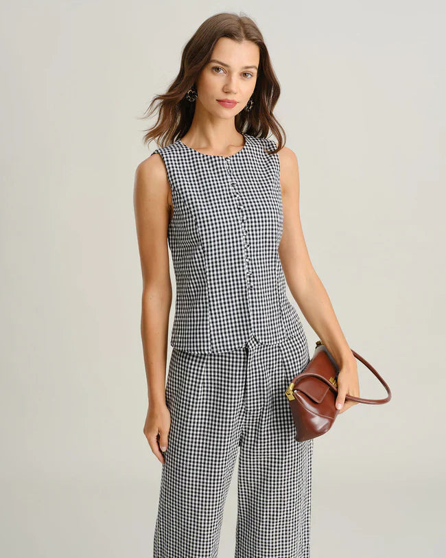This sleeveless two piece set is perfect. It drapes well, moves well and looks fantastic. I bought my usual size and it isn't too baggy but at the same time, it doesn't squeeze at the waist.